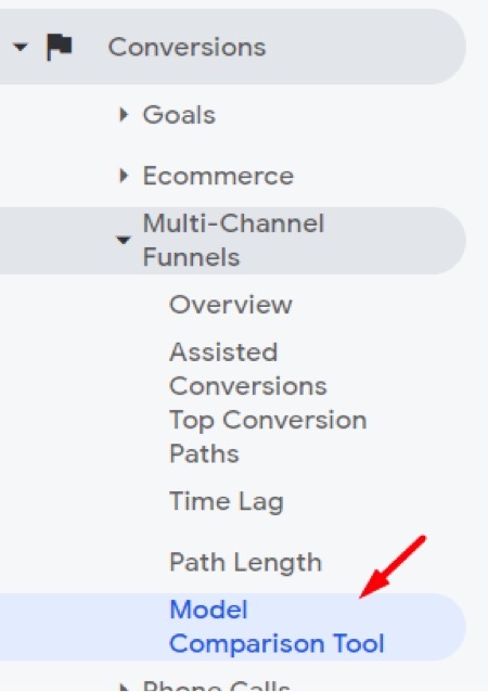 接下来,在Google Analytics中转到转化>多渠道渠道>模型比较工具。