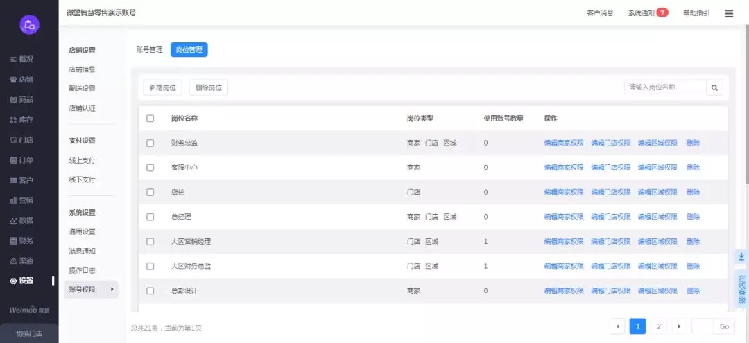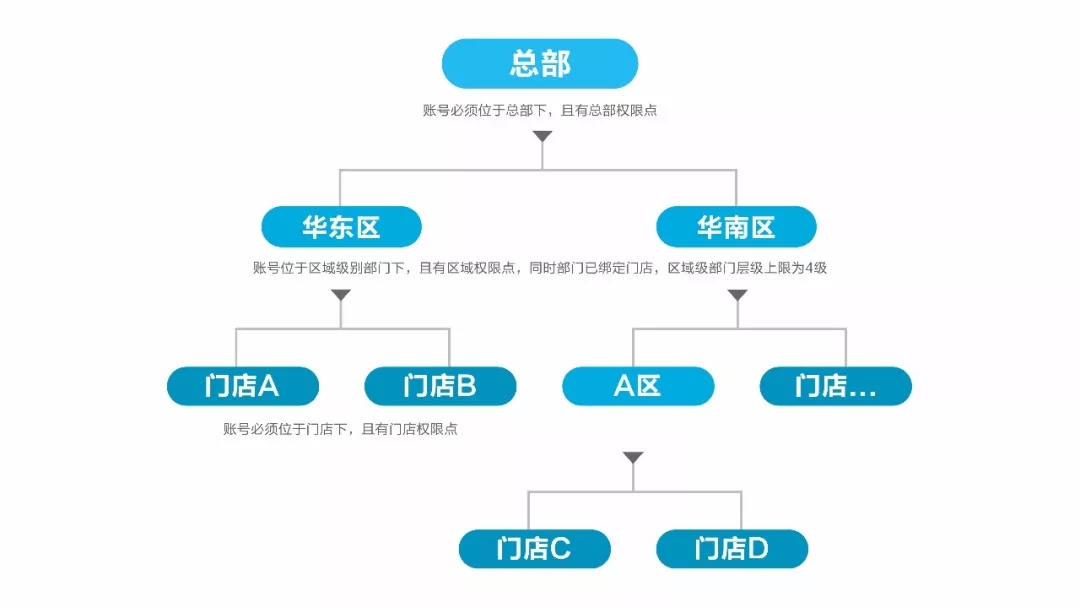 公告显示,岗位管理功能取代了原有的角色管理功能,在新的权限管理架构中,商家首先要设置不同岗位,为岗位分配所需后台层级权限,层级从高到低依次为商家、区域、门店,无对应层级权限的人无法看到相应的后台管理入口。一个岗位可以同时拥有总部后台、区域后台、门店后台三种层级的后台权限。