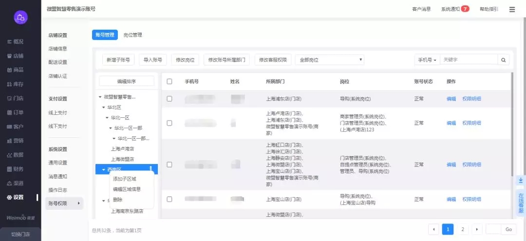 对岗位设置完毕后,商家需要新增子区域,并为区域分配下属门店及对应权限。在执行了新增子区域、为区域分配下属门店、为区域管理人员(子账号)分配区域及下属门店管理权限的三步操作后,区域管理者使用其子账号登录后台,即可看到区域管理后台入口。