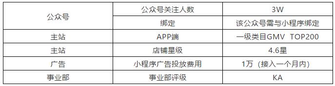 具体来看,要求公众号关注人数在3万以上,且需要该公众号与小程序绑定。主战方面,要求APP端一级类目GMV位于前200名,店铺星级需达到4.6级。此外,小程序广告投放费用需要在接入一个月内达到1万,并且事业部评级达到KA。