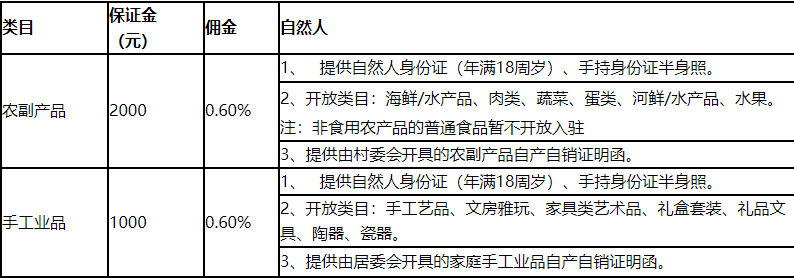 1、农副产品上交保证金2000元,需提供自然人身份证、手持身份证半身照以及由村委会开具的农副产品自产自销证明函;
