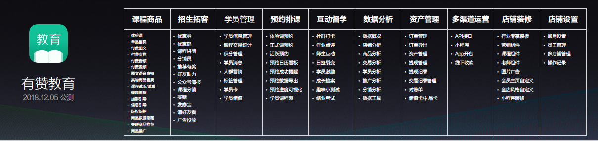 据亿邦动力了解,有赞教育具有六大功能优势,帮助商家打造闭环式教育培训体系: