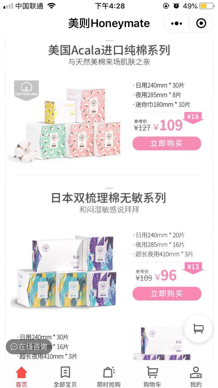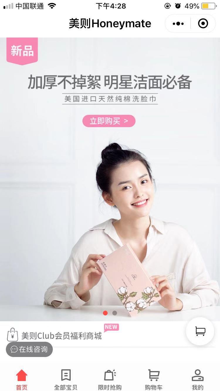 亿邦动力了解到,美则Honeymate商城在售品类包括:纯棉洗脸巾、纯棉卫生巾、红糖花茶、零食等。同时,商城还有“限时抢购”一栏,可以进入享受拼团、限时优惠、以及会员优惠商城等。
