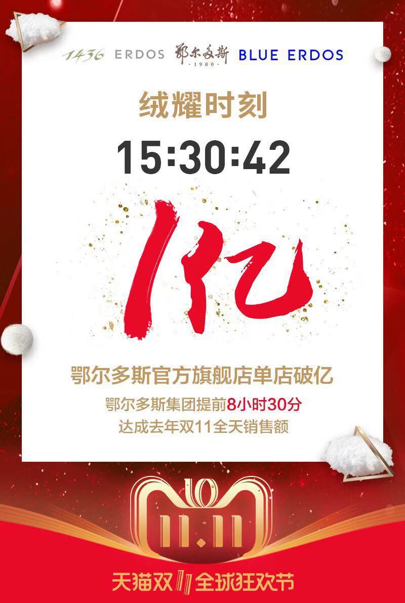 鄂尔多斯集团双11销售额突破1亿元;同时,截至11日15时30分40秒,鄂尔多斯天猫官方旗舰店单店销售额突破1亿元。