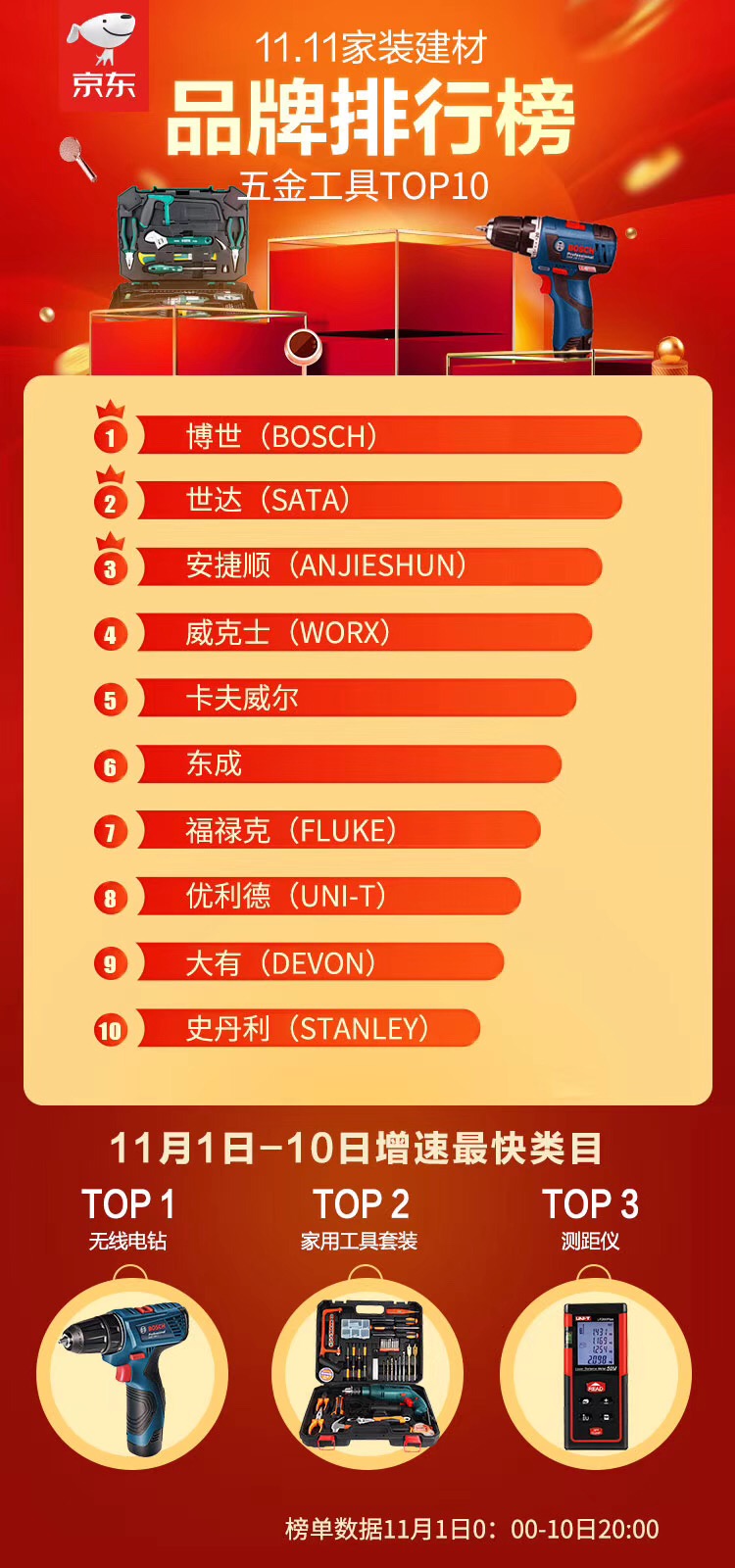 榜单显示,五金工具成交额排在前三位的分别是:博世(BOSCH)、世达(SATA)、安捷顺(ANJIESHUN)。同时,增速最快类目前三分别为:无线电钻、家用工具套装、测距仪。