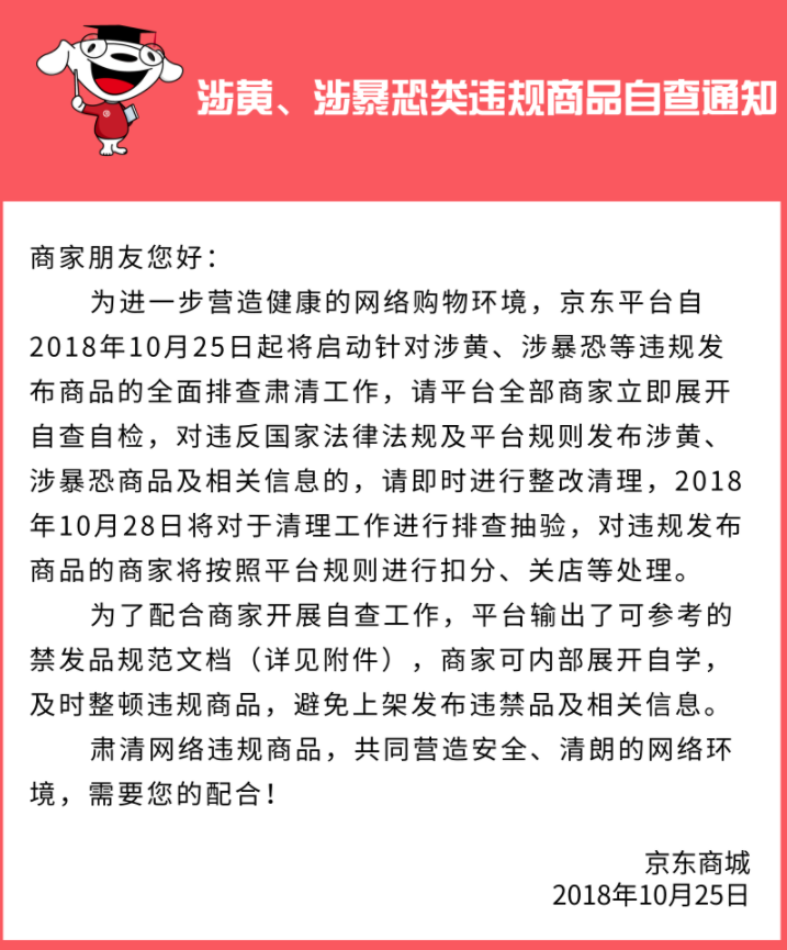 通知中表示,京东平台自2018年10月25日起将启动针对涉黄、涉暴恐等违规发布商品的全面排查肃清工作。对违反国家法律法规及平台规则发布涉黄、涉暴恐商品及相关信息的,要即时进行整改清理。10月28日将对于清理工作进行排查抽验,对违规发布商品的商家将进行扣分、关店等处理。