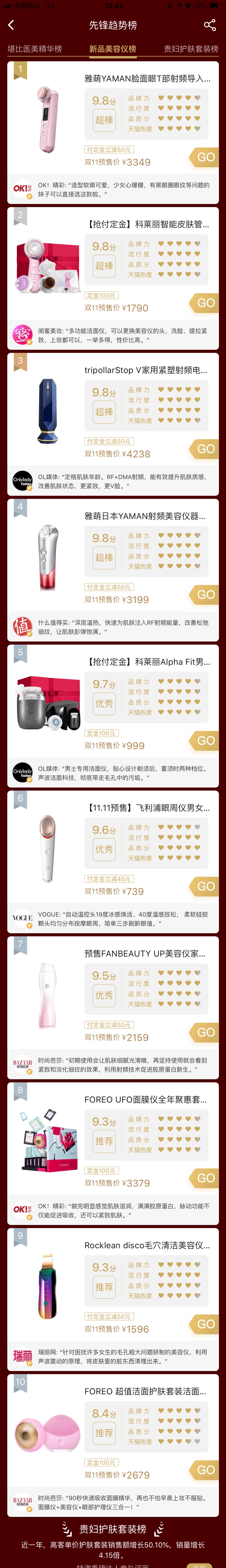 截至22日下午14时,新品美容仪榜单中,预售前三名分别是雅萌电子美容仪、tripollarStop V射频童颜机、科莱丽洁面仪。