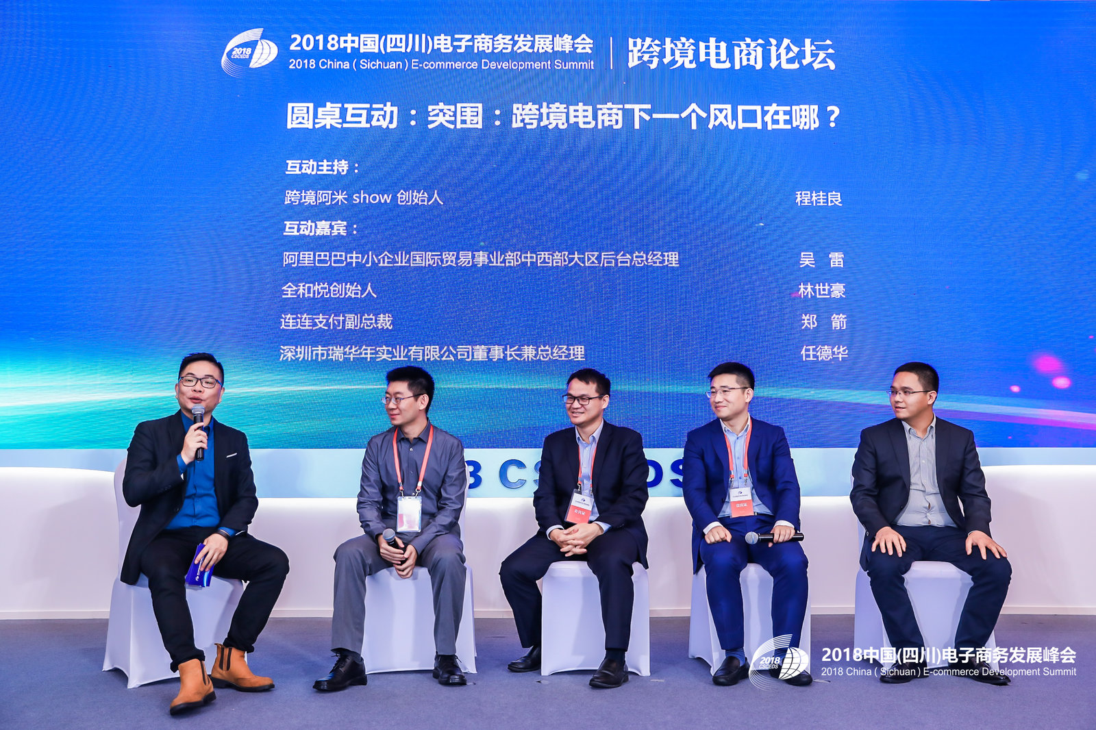 【亿邦动力讯】10月18日消息,在2018中国(四川)电子商务发展峰会“跨境电商论坛”上,跨境阿米show创始人程桂良为主持人,阿里巴巴中小企业国际贸易事业部中西部大区后台总经理吴雷、全和悦创始人林世豪、连连支付副总裁郑箭、深圳市瑞华年实业有限公司董事长兼总经理任德华为嘉宾发表了题为《突围:跨境电商下一个风口在哪?》的圆桌讨论。