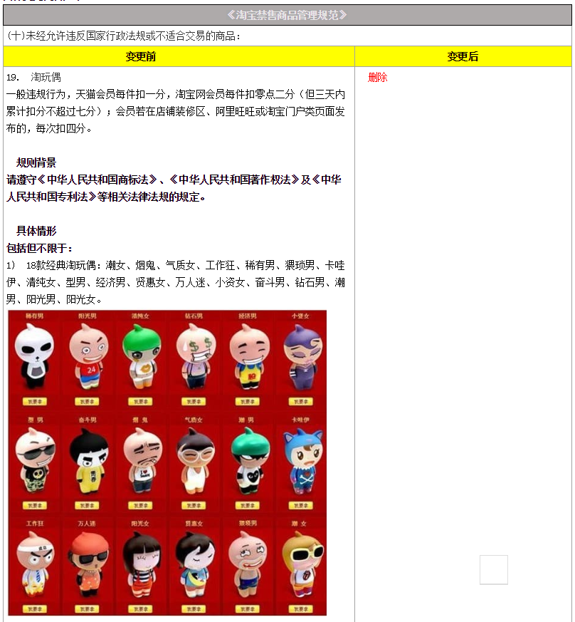 亿邦动力了解到,此次规则主要变更点为,取消对“淘玩偶”商品的管控。
