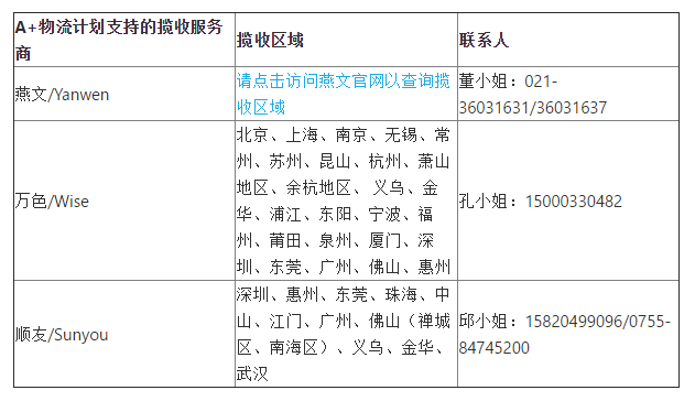 在此期间,商户可以选择以自配送的方式或通过物流服务商燕文、万色、顺友将订单配送至仓库。目前,三家物流服务商支持的揽收区域有义乌、金华、深圳、广州、东莞等。
