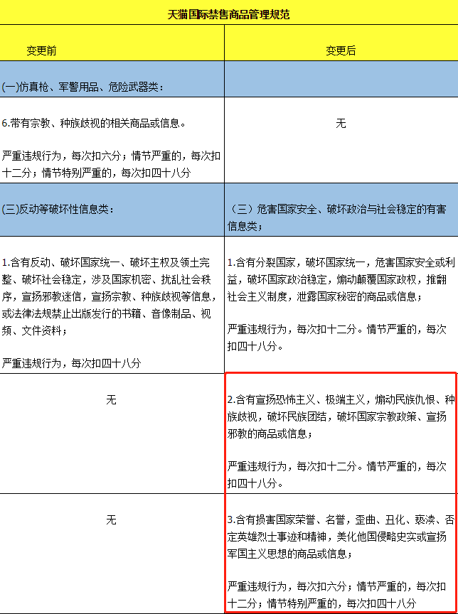 【亿邦原创】4月16日消息,为进一步加强对危害国家安全、破坏政治与社会稳定的有害信息等的管控,天猫国际对《天猫国际禁售商品管理规范》进行了调整。