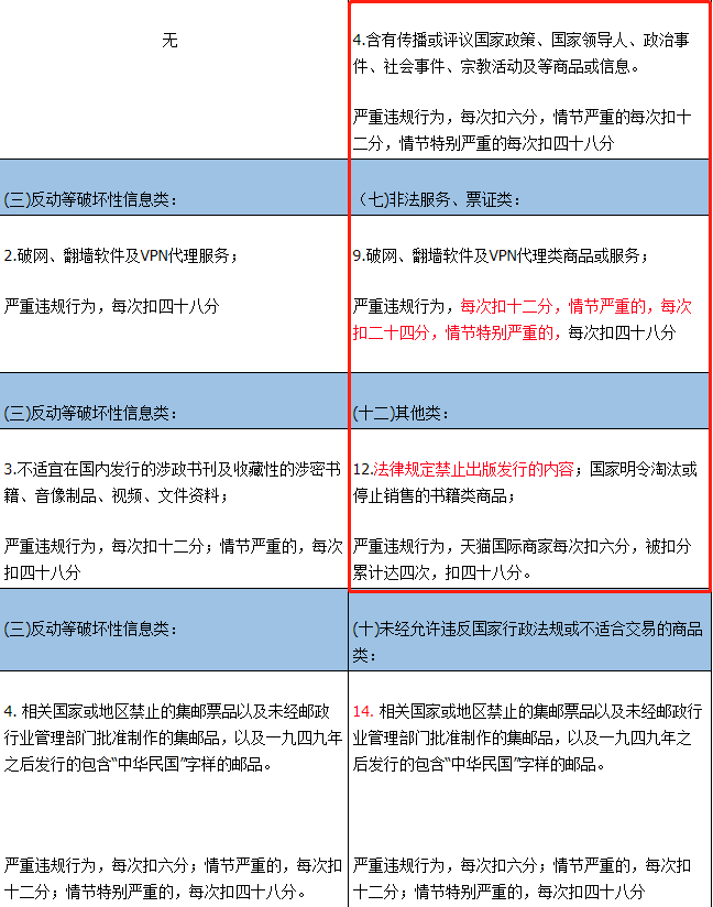 1、严重违规行为,天猫国际商家每次扣六分;