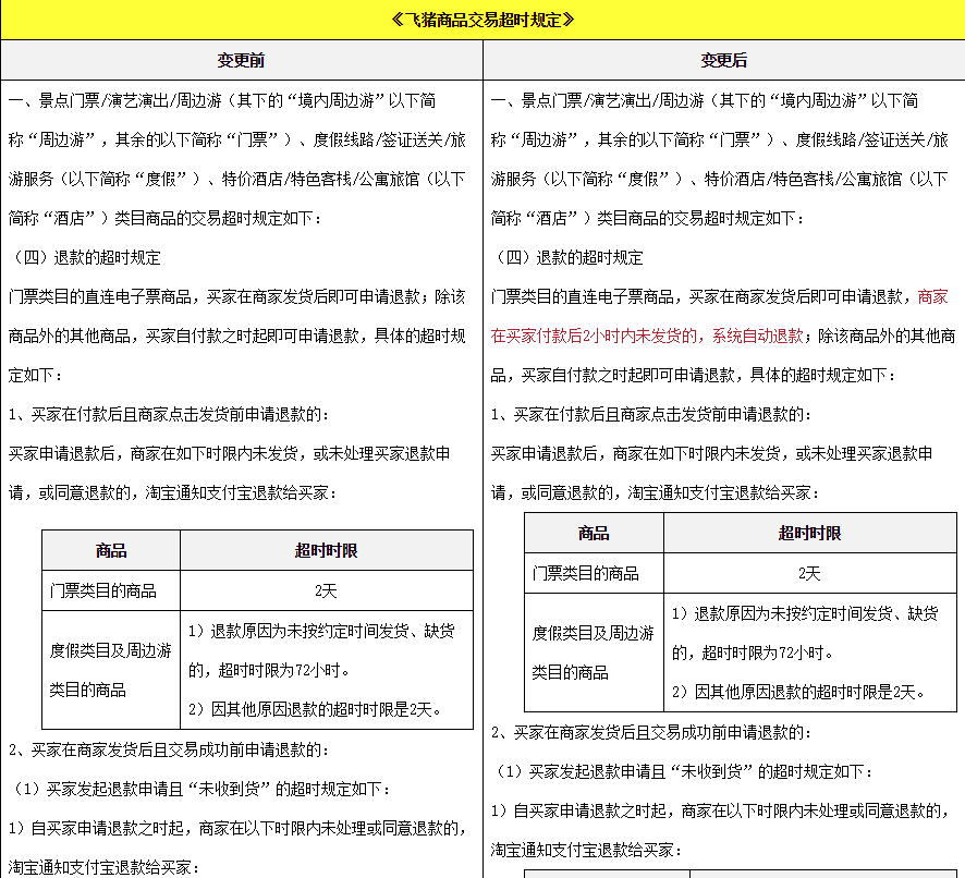 【亿邦原创】3月26日消息,为保障消费者购物体验,维护市场秩序,飞猪平台修订了《飞猪商品交易超时规定》,调整在中国大陆使用的手工电子票的退款超时规定。