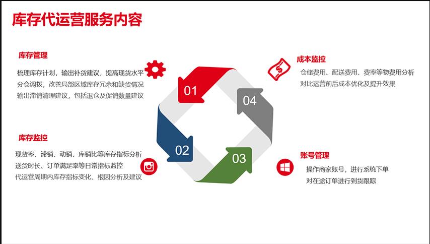 具体来看,库存代运营的服务内容主要包括库存管理、库存监控、库存监控、成本监控四个方面: