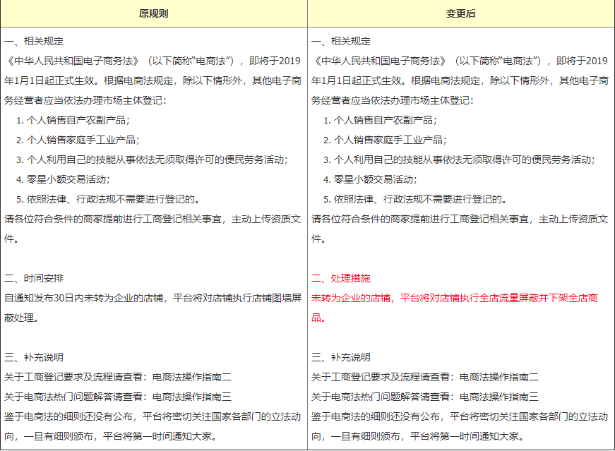 《中华人民共和国电子商务法》正式生效后,未转为企业的店铺,平台将对店铺执行全店流量屏蔽并下架全店商品。