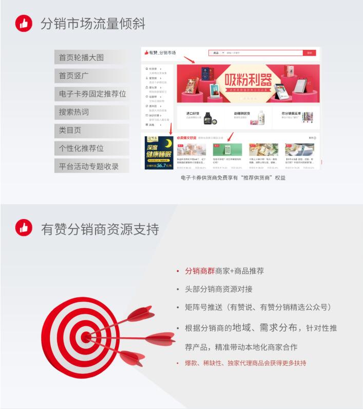 有赞分销市场可为商家提供包括首页轮播图、个性化推荐位、搜索热词、类目页在内的多种流量支持;有赞分销商也会为商家提供资源对接、矩阵号推送等资源支持。