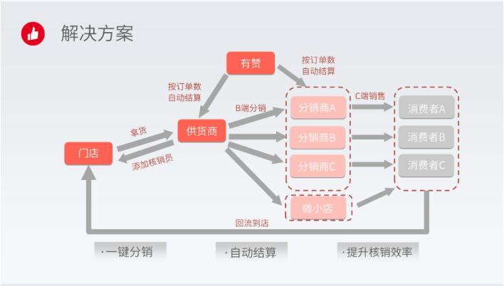 对于有渠道的有赞微商城商家,平台可提供分销功能支持;对于有渠道的非有赞为商城商家,可在平台上免费开设小店,并拥有独立后台。而针对无渠道的商家,有赞即可为其提供市场分销商资源。