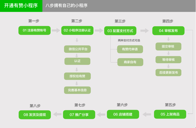 据亿邦动力了解,已开通有赞小程序的商家可通过在微信申请注册小程序,并授权给有赞。完成申请认证流程后即可在有赞后台搭建、运营自己的小程序店铺。