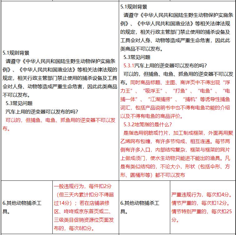 (二)动植物、动植物器官及动物捕杀工具类:常见问题中“汽车上用的逆变器可以发布的吗?”回答添加“同时商品标题、主图、商详页中不得出现“浮力王”、“吸浮王”、“打鱼”、“电鱼”、“电捕一体”、“江湖捕捞”、“捕机”等诱导性捕鱼词汇,包括产品说明书中也不得有电鱼功能的介绍以及不得有电鱼的商品评价。”同时,新增对“地笼”的解释说明,以及修改其他动物捕杀工具扣分规则为:严重违规行为,每次扣4分。情节严重的,每次扣12分。情节特别严重的,每次扣25分。