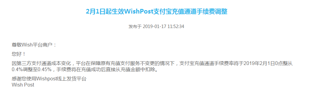 【亿邦动力讯】1月17日,亿邦动力获悉,Wish邮发布公告,称因第三方支付通道成本变化,平台在保障原有充值支付服务不变更的情况下,支付宝充值通道手续费率将于2019年2月1日0点整从0.4%调整至0.45%,手续费将在充值成功后直接从充值金额中扣除。