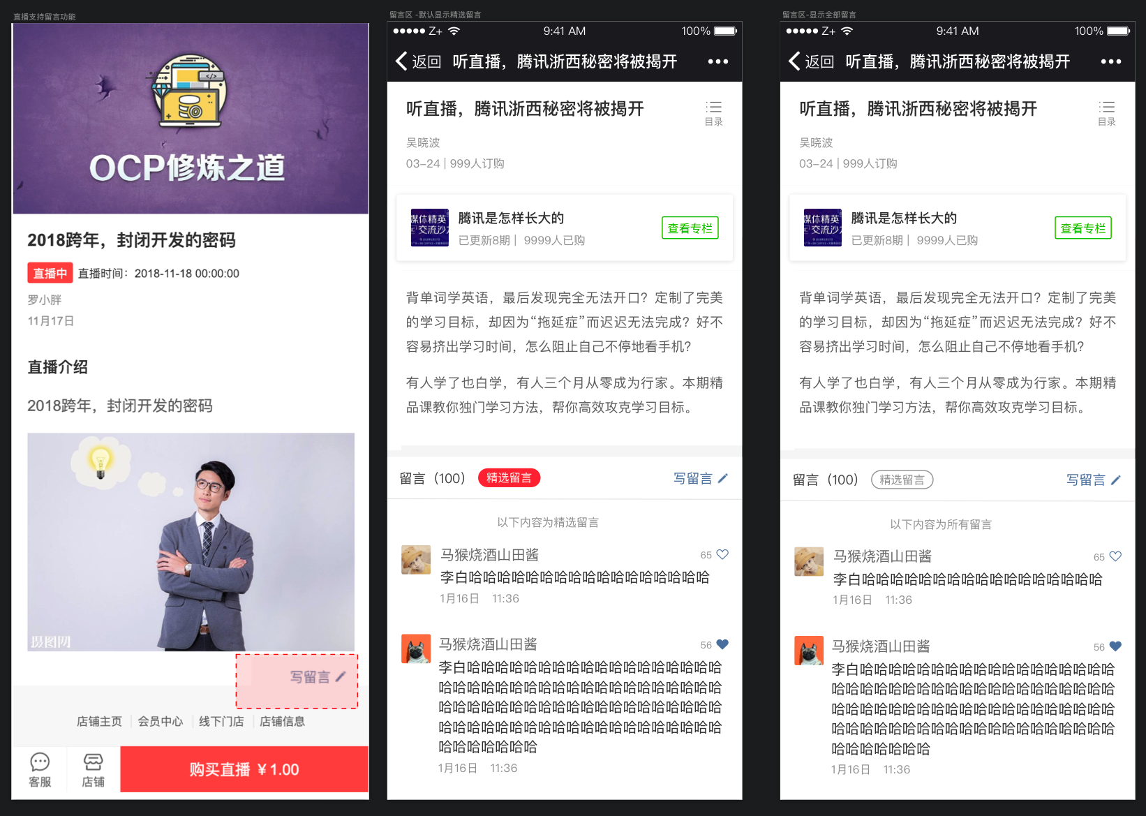 2.用户对知识付费商品(内容、直播)的留言,会全部显示到用户内容购买和查看页面(升级前是“商家设为精选的留言”才会显示出来)。