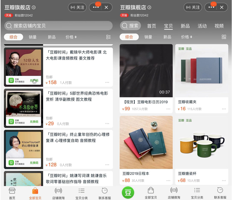 据了解,豆瓣已2017年10月30日在天猫开设旗舰店,开店时间为,目前粉丝数为1.2万。店铺内在线售卖书籍、音频教程、豆瓣周边等产品。