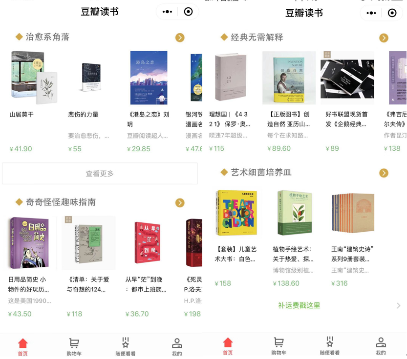 据亿邦动力了解,“豆瓣书店”目前共上线包含“治愈系角落”“奇奇怪怪趣味指南”“经典无需解释”“艺术细菌培养皿”等类目书籍和豆瓣周边等22件商品。