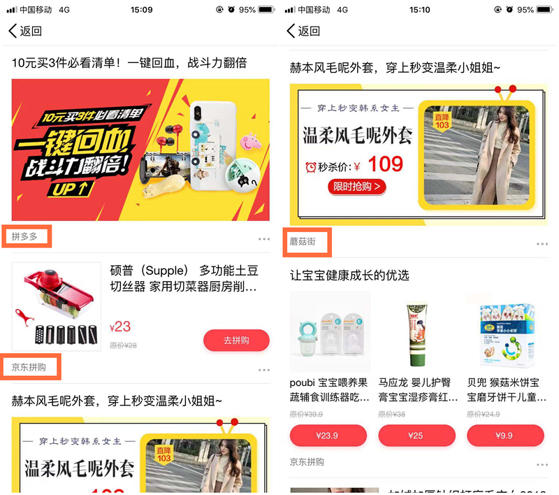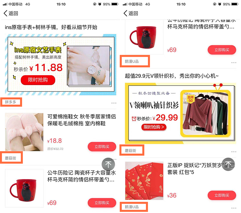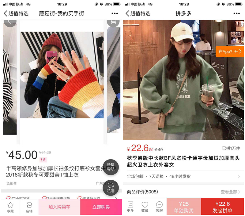 (左为蘑菇街商品详情页,右为拼多多商品详情页)