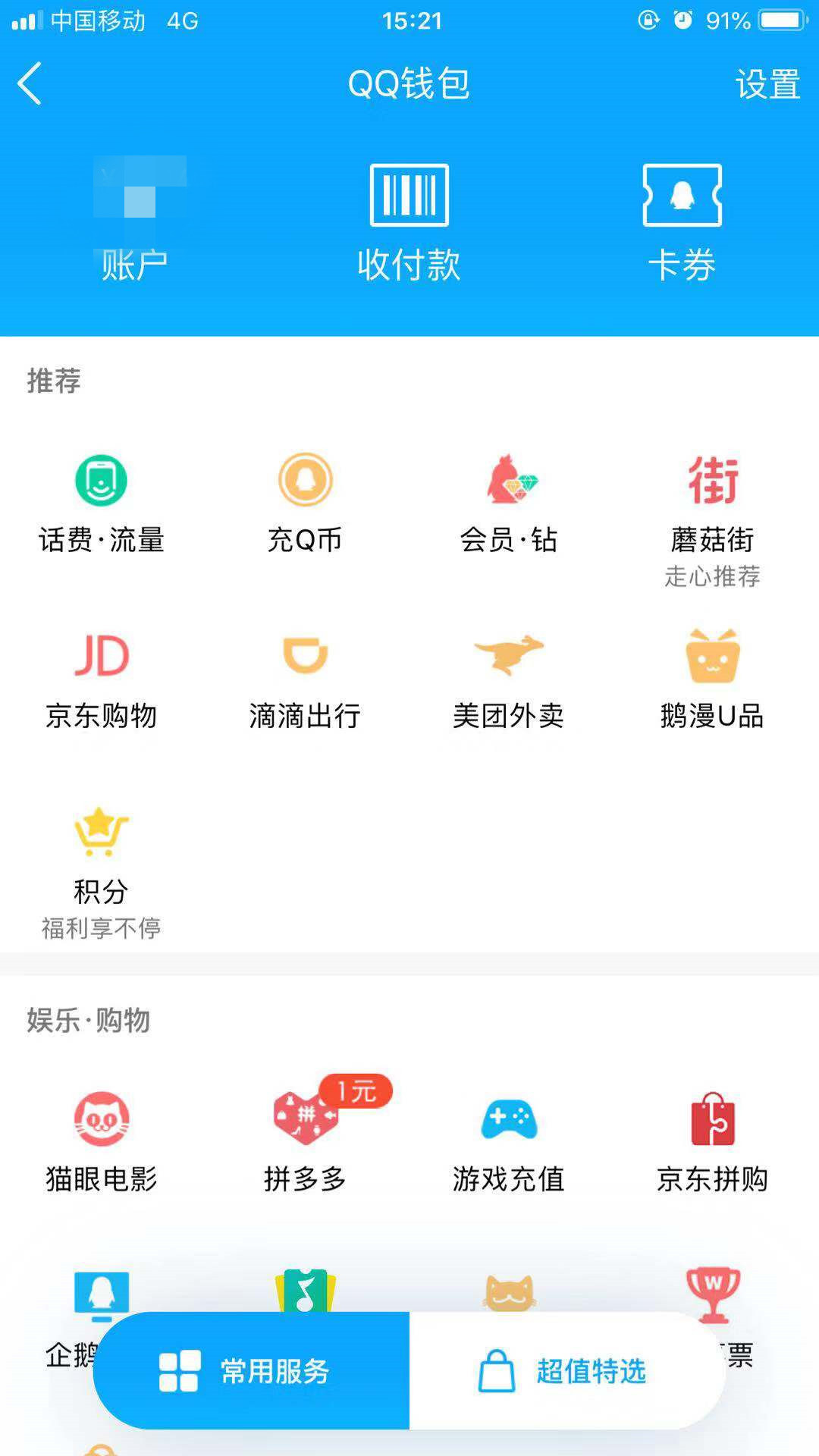 亿邦动力了解到,目前在QQ钱包的常用服务页面,已接入蘑菇街、京东购物、鹅漫U品、滴滴出行、美团外卖、猫眼电影、拼多多等入口。
