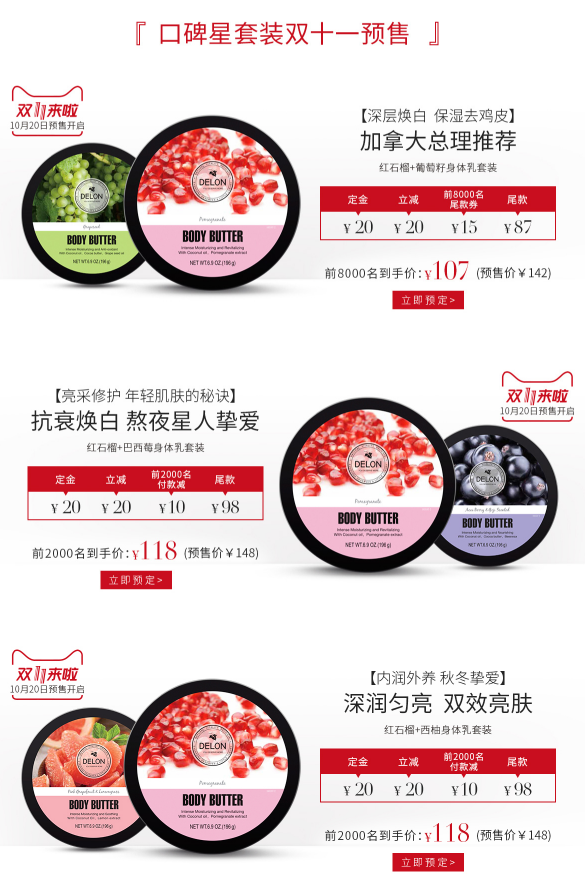 DELON品牌总监虞景秀告诉亿邦动力,早在今年88大促之后,DELON身体乳就已经登上了天猫国际身体乳类目TOP1;10月份,DELON在淘宝身体乳类目品牌中已排名第四;今年双11,DELON品牌将展开全渠道营销,目前为止,已经实现了线上线下联动。
