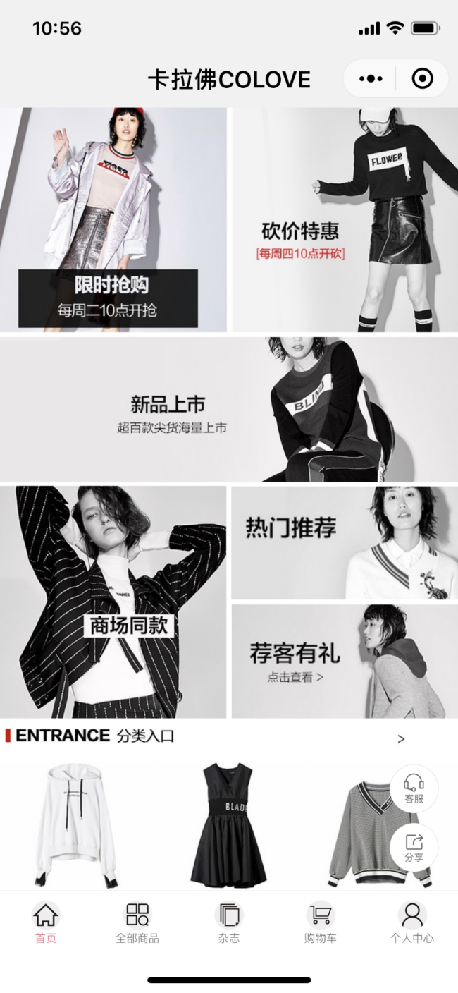 据悉,卡拉佛将在小程序上销售旗下旗舰品牌“COLOVE卡拉佛”,除上架了T恤、衬衫、卫衣、风衣等专卖店同款外,还推出了线上专供款、明星同款等频道,此外,还将通过使用使用微商城中的优惠券、限时抢购、砍价、分销、拼团等社交玩法提升小程序商城销量。在小程序推广方面,卡拉佛在微博、公众号等社交媒体上生产原创内容来与用户互动,为小程序进行引流。