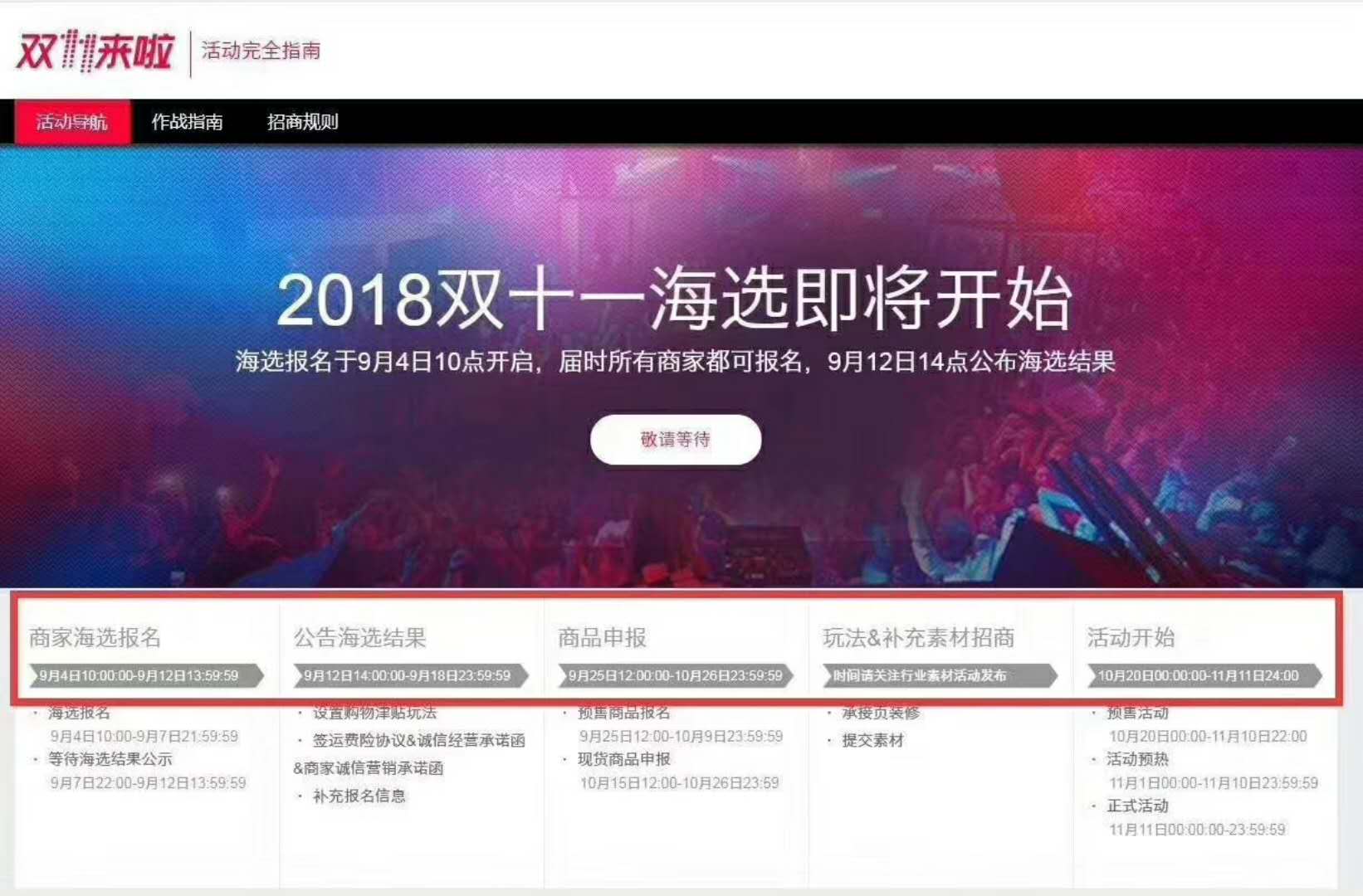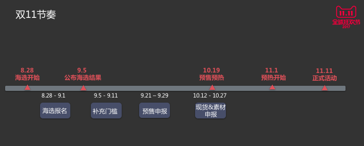 亿邦动力得知,去年的双11海选从8月28日海选开始,9月5日公布海选结果;9月5日-9月11日补充门槛;9月21日-9月29日预售申报;10月12日-10月27日现货&素材申报,其中10月19日开启预售预热。