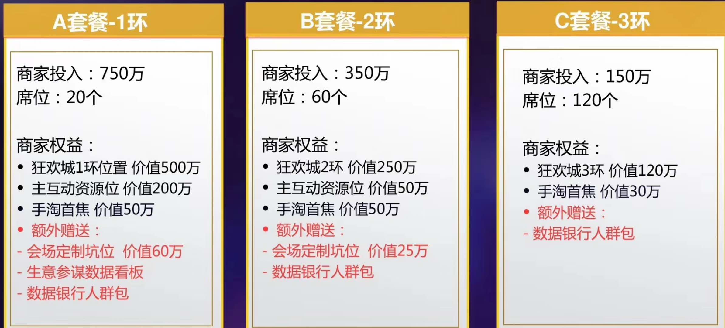 C套餐-3环:商家需要投入150万,共有120个席位。商家可获得的对应权益为:狂欢城3环位置(价值120万),手淘首焦(价值30万),同时还可获得额外赠送的数据银行人群包。