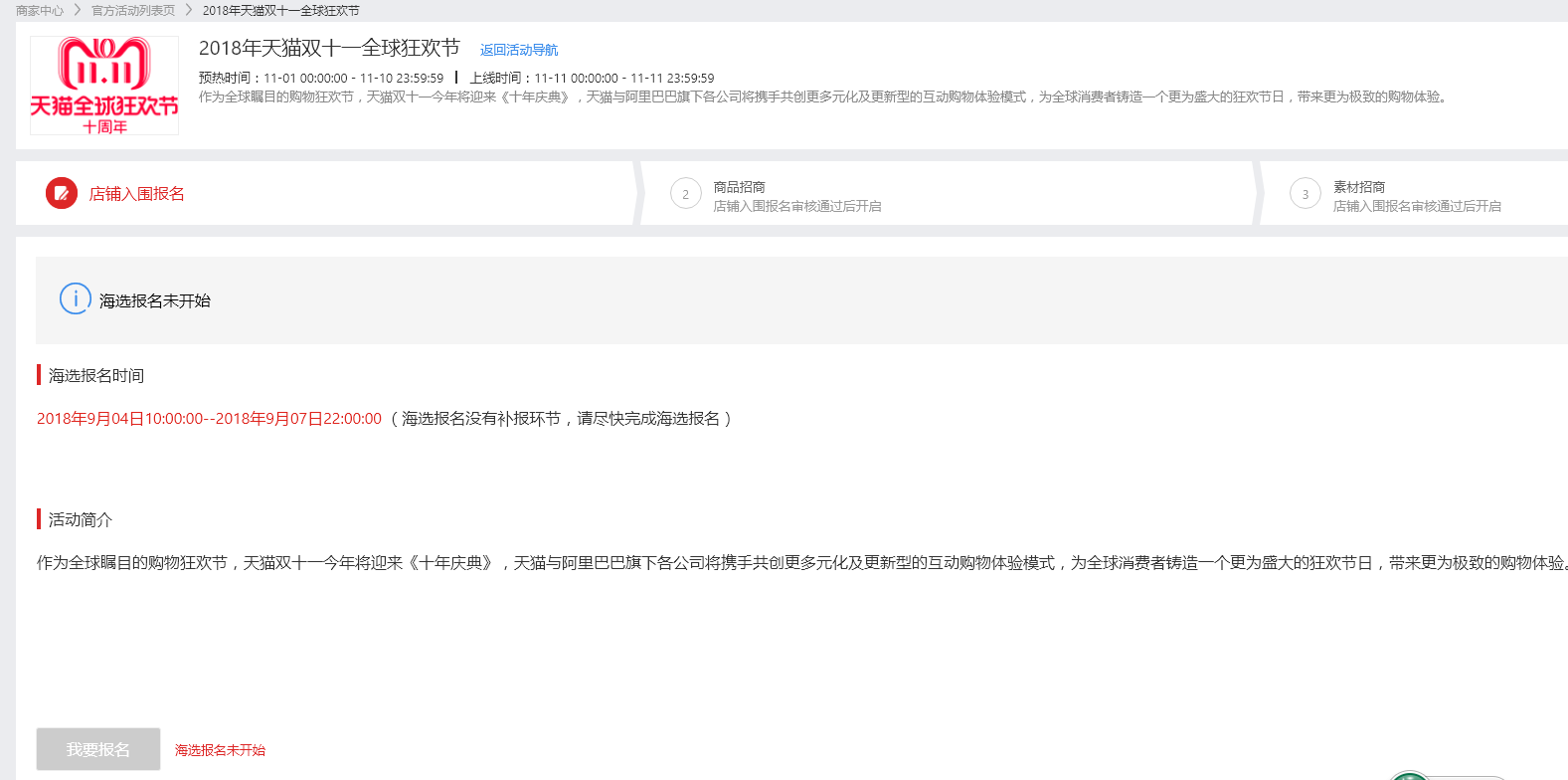 【亿邦动力讯】9月3日消息,亿邦动力获悉,天猫2018双11的商家海选将在9月4日10点正式开启,届时所有商家均可报名,报名结果将于9月12日14点公布。