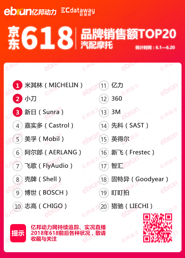 【亿邦动力讯】6月26日消息,亿邦动力联合数据威发布,在6月1日-6月20日期间,京东618汽配摩托品牌销售额TOP20榜单。