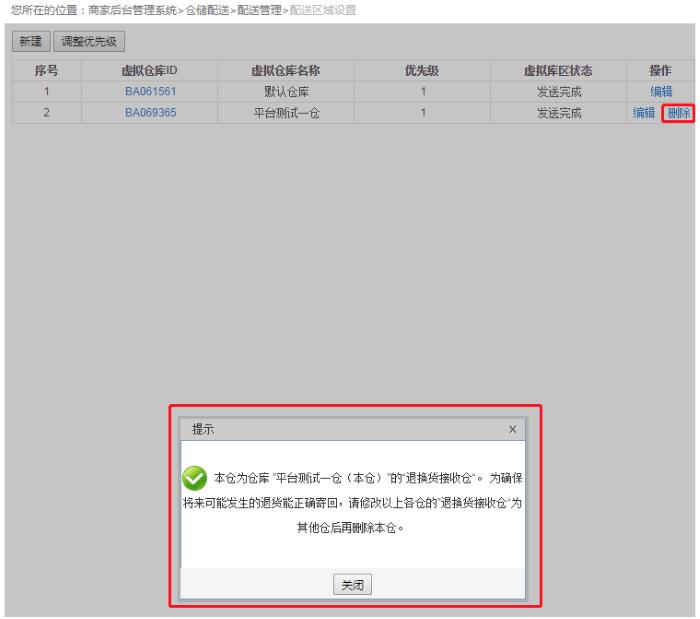 在处理旧数据时,同样需要商家设置仓库优先级。而删除仓库时,首先要确保“待删除仓库”不为某仓库(包含本仓)的“退换货接收仓”,才能删除。