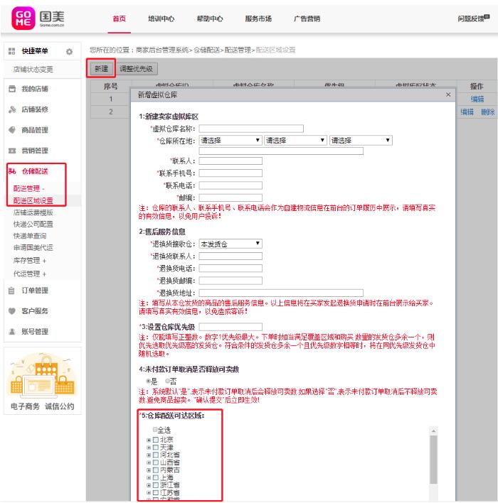 首先,一个店铺可同时设置多个仓库,且覆盖区域允许重叠,如A仓和B仓同时都可以配送北上广等相同地区。