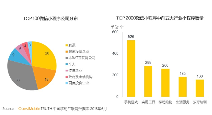数据显示,TOP2000微信小程序中前五大小程序数量排行:手机游戏526、实用工具288、移动购物260、生活服务185、教育培训160。