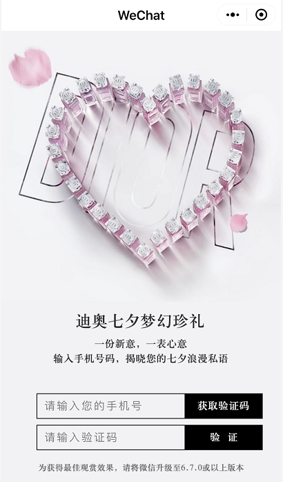 在DIRO的另外一个小程序商城“迪奥七夕梦幻珍礼”内,用户只需输入手机号码即可验证属于自己的“梦幻珍礼”。