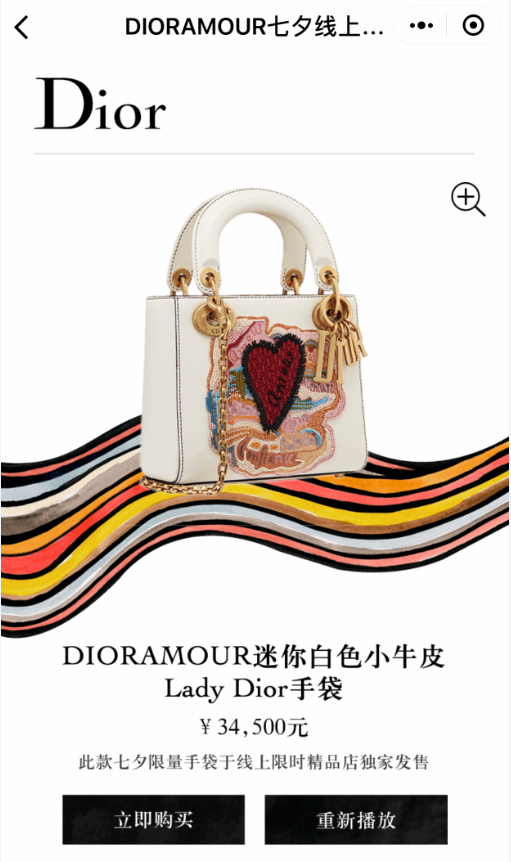 在“DIROAMOUR七夕线上限时精品店”内,有一款DIROAMOUR迷你白色小牛皮手袋在线售卖,并提示为“此款七夕限量手袋于线上限时精品店独家售卖”。