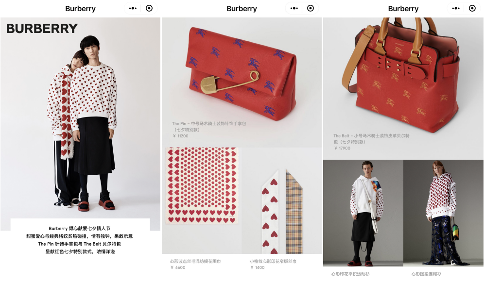 “BURRERRY七夕系列”商城内,在线售卖七夕商品有手拿包、围巾、丝巾、以及运动衫和连帽衫等。