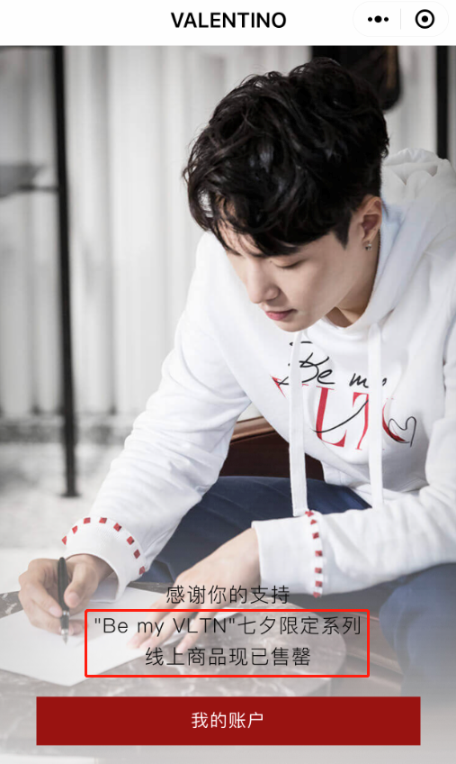 而在“VALENTINO七夕限定系列”商城主页面内,显示七夕限定系列线上商品现已售罄。据悉,VALENTINO于1960年成立于罗马,是著名的意大利奢侈品牌。