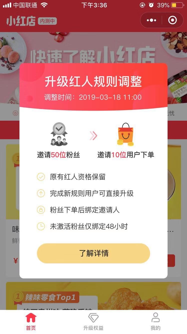 据亿邦动力了解,近日小红书正在内测社交电商项目“小红店”。在内测阶段,小红店开启了“红人计划”,用户通过分享给好友注册后成为该用户的粉丝,粉丝达到50人即可成为红人。升级红人规则调整后,用户邀请10位粉丝下单可直接成为红人。