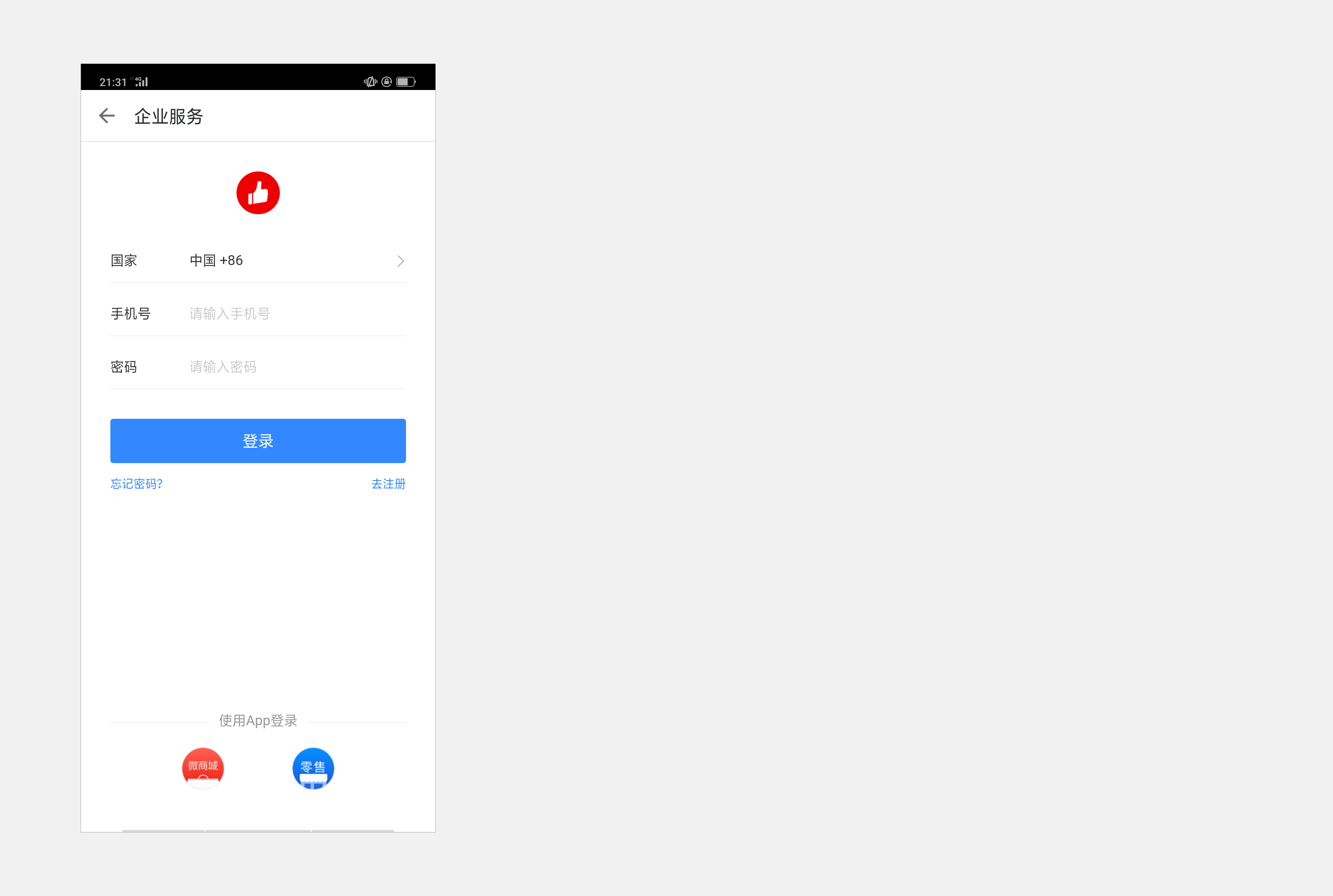登录页面提供了三种登录方式:a.输入账号和密码直接登录;b.对于微商城商家,如果微商城App已经处于登录状态,也可以点击下方的微商城App的Logo,实现快捷登录;c.对于零售商家,如果零售App已经处于登录状态,也可以点击下方的零售App的Logo,实现快捷登录。