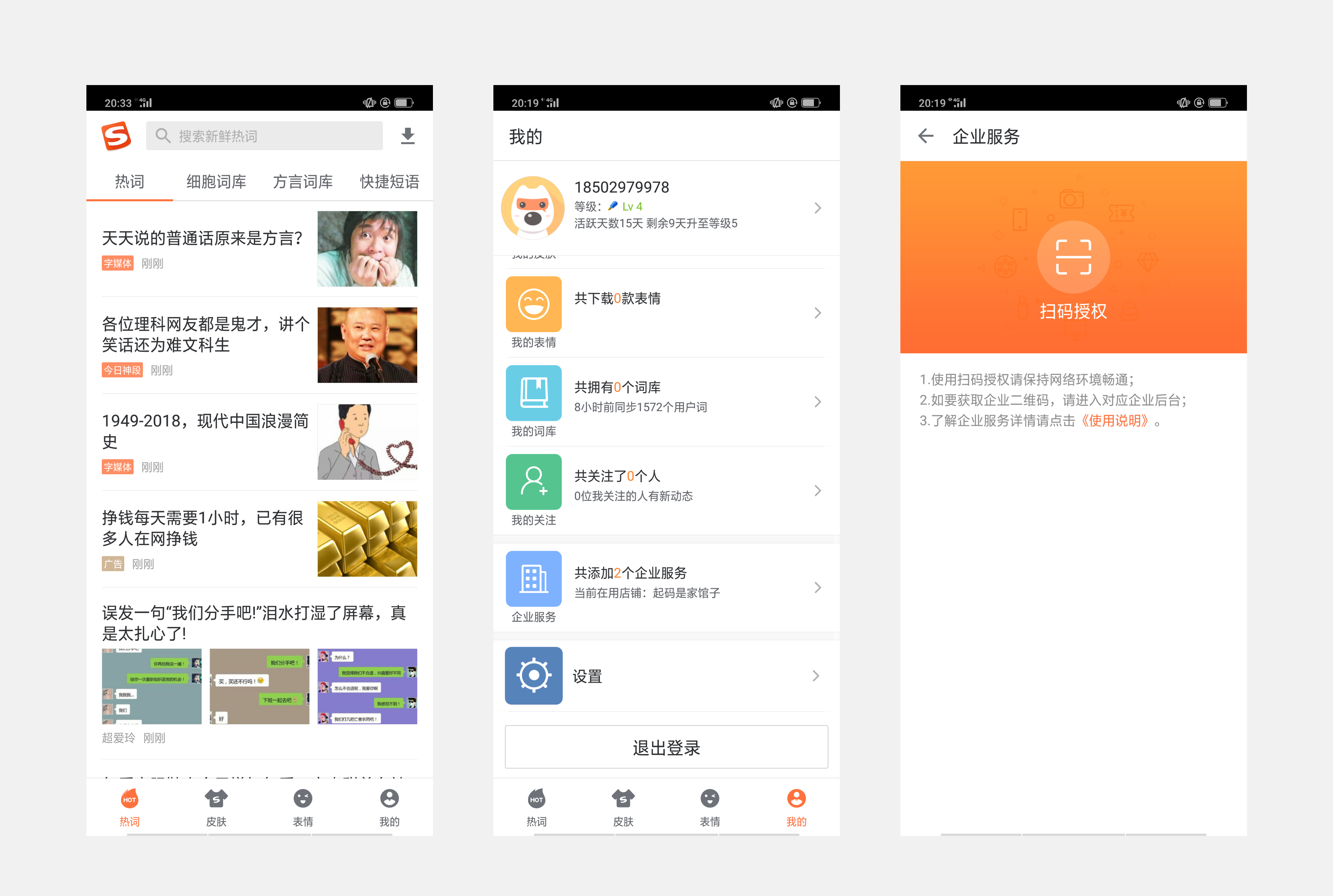 使用手机打开最新版的搜狗输入法App,登录搜狗账号后,进入“我的-企业服务”,点击“扫码授权”,扫一扫上述二维码,进入到有赞账号和密码的登录页面