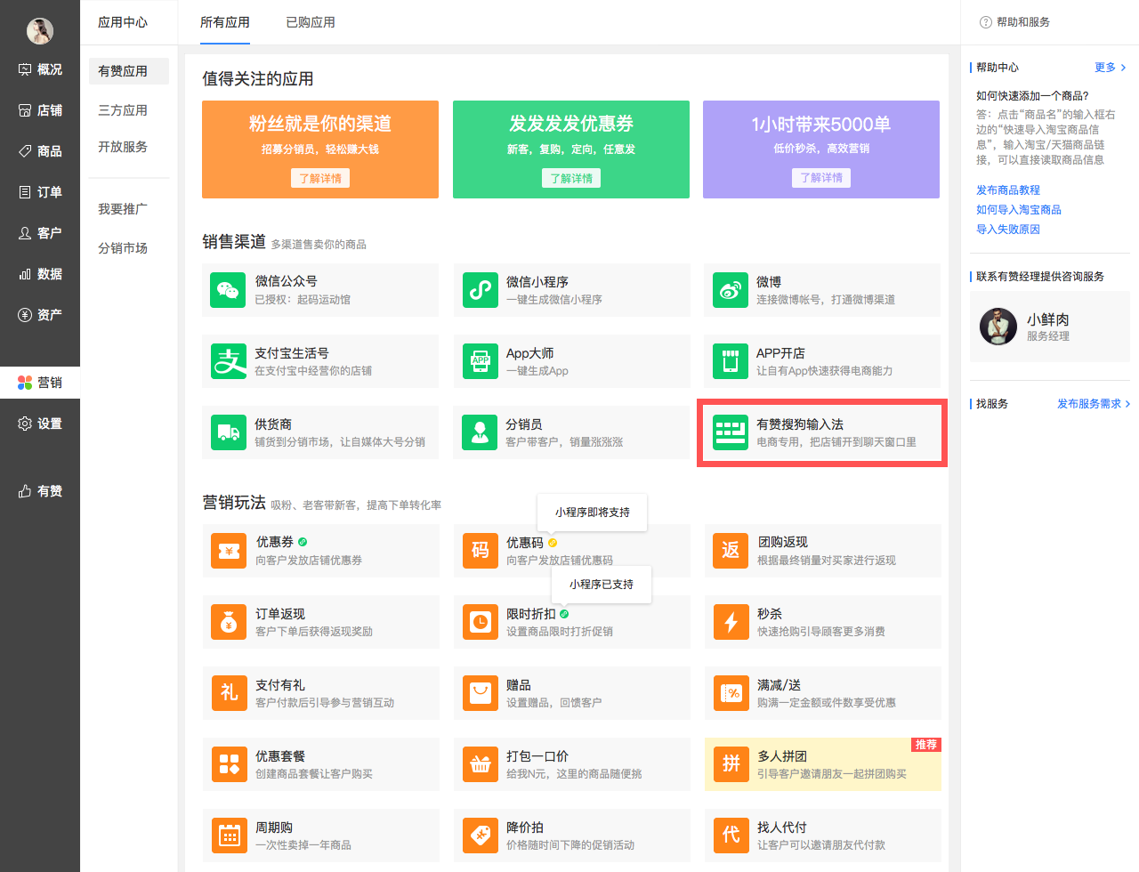 1、商家后台-营销-销售渠道-有赞搜狗输入法,如下图红色框所示: