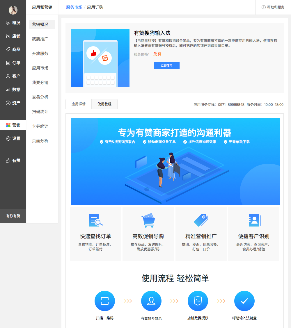 2、点击入口,进入到有赞搜狗输入法的详细介绍页面,会详细介绍产品的主要功能和使用教程:
