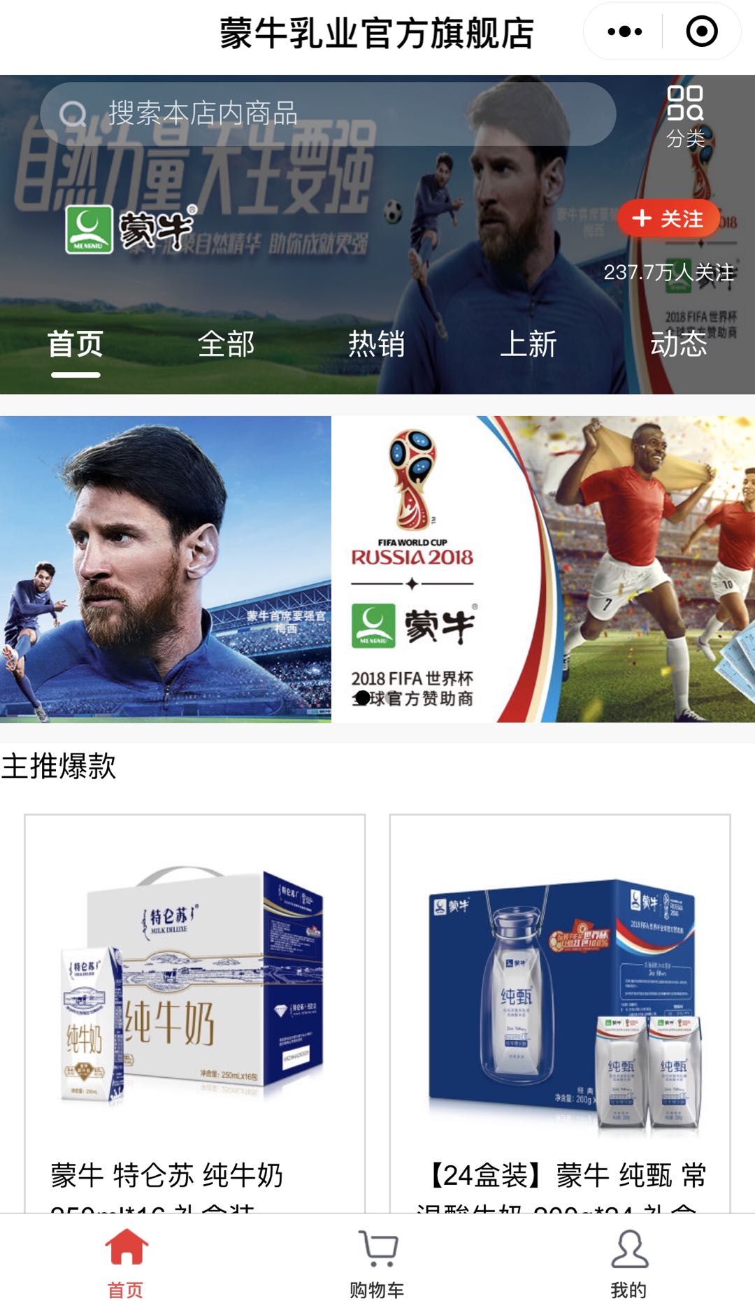 【亿邦动力讯】7月3日消息,亿邦动力获悉,蒙牛小程序商城“蒙牛乳业官方旗舰店”已上线数日,关注粉丝数达237.7万人,京东开普勒提供技术支持。