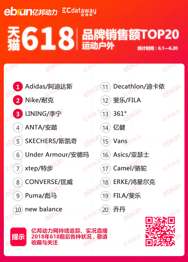 【亿邦动力讯】6月26日消息,亿邦动力联合数据威发布,在6月1日-6月20日期间,天猫618运动户外品牌销售额TOP20榜单。