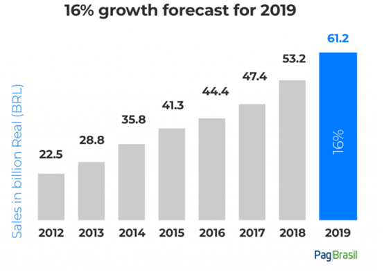 截至2018年底,巴西在线零售收入增长12%,销售额达532亿巴西雷亚尔(约合人民币641亿元),2019年在线零售额增长约16%,达到612亿巴西雷亚尔(约合人民币738亿元)左右。